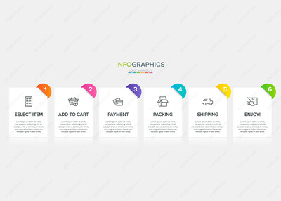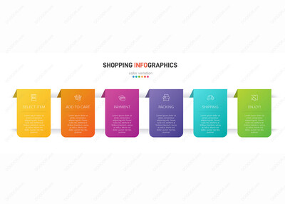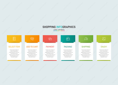 六个彩色图形元素购物过程图标文本矢量模板