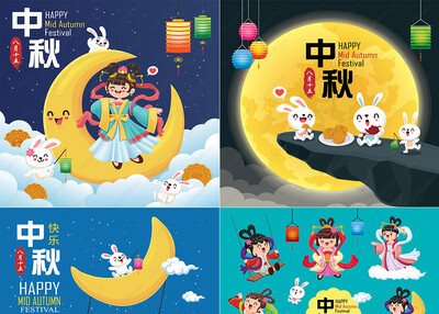 4款可爱卡通版中秋节嫦娥玉兔月亮快乐插画矢量素材-VOL-04
