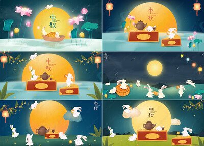 6款快乐中秋节可爱小白兔月亮荷花灯笼海报矢量素材