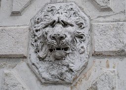 灰白色的墙壁上雕刻着一个栩栩如生的狮子头像建筑素材设计
