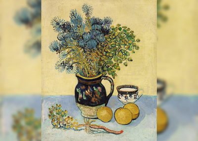 一幅油画作品描绘着一个插画花瓶旁边放着一个杯子和几个橘子背景花纹素材设计