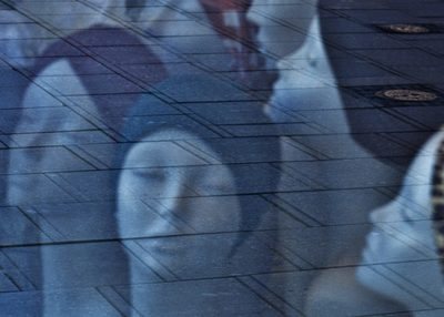 干净的橱窗反射出店铺内人体模特的影子模糊了外面的青石街道背景花纹素材设计