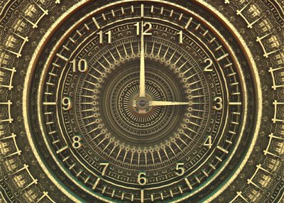 一座古老的哥特式钟指向三点钟方向在阳光下泛着黄色的金属光泽背景花纹素材设计
