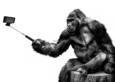 灰色背景下一只大猩猩正在模仿人类拿着自拍杆进行拍照十分有趣动物素材设计