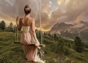 坐在山顶的秋千上俯瞰世多姿多彩的雪山世界