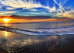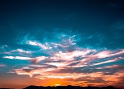 日出时分天边烧起了火烧云红色的云彩在湛蓝天空的映衬下格外美丽