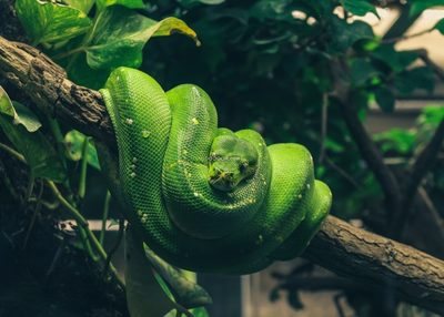 一条翠绿色的蛇盘在干枯的树枝上形成了鲜明的色彩对比动物素材设计