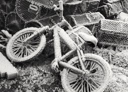寒冷冬季的清晨户外的自行车上面覆盖着厚厚的冰晶自然风景素材设计