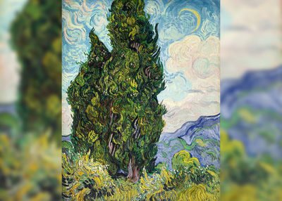 一幅艺术画作上面描述着一轮弯月挂在混沌的天空中地面上是青山翠柏