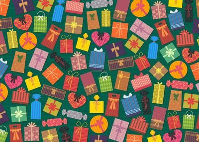 深绿色的背景板上面是各式各样的形状颜色不同的包装礼盒图案背景花纹素材设计