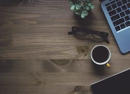 胡桃木的桌面上放置着一杯咖啡一只黑色眼镜以及一台笔记本电脑