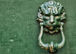 绿色的墙体上面有一尊生锈的铜质狮子头像门环建筑素材设计