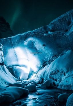 星空素材设计冬日的夜晚一个人在野外的河边打着探照灯点亮雪白的世界