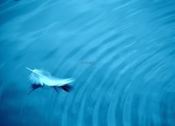 一颗白色的羽毛飘落在荡漾着波纹的蓝色的水面上自然风景素材设计