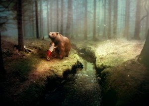 在静谧的森林深处的的小溪旁一个小孩鱼灰熊和谐相处