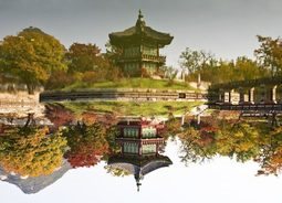倒立拍摄公园里的亭台楼阁水面的一点点波纹模糊了倒影自然风景素材设计