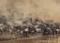 动物大迁徙成群的动物奔走在荒漠上准备过河一路上河烟尘弥漫