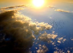 天空一片湛蓝成群的鸟儿从空中掠过在动与静之间达到完美平衡