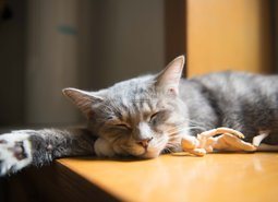 慵懒的猫抱着玩具人在午后的阳光里小憩