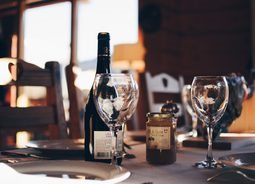 高档餐厅的餐桌上放着一瓶红酒以及两个高脚杯食物饮品素材设计