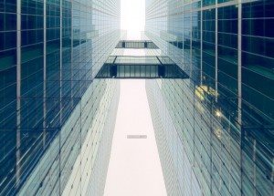 现代都市里对称建造的摩天大楼有两条透明玻璃廊道