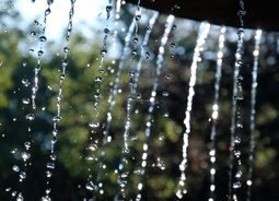 晶莹的水滴从屋檐下面滴落在阳光下反射出金色的光芒自然风景素材设计