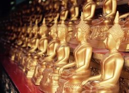 泰国曼谷寺庙内摆放着一座座金黄色的佛像宗教素材设计