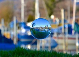 一个晶莹剔透的水晶球倒映出远处村庄的景象科学技术素材设计