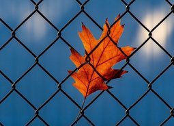 天气晴朗天空碧蓝一片红色的枫叶贴在铁篱笆上面植物素材设计