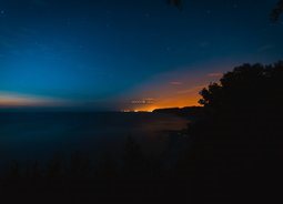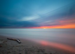 水面平静毫无波澜太阳在落下之前依旧洒下一缕余晖染红了天边
