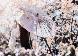 初春时节一位女士打着花伞形行走在樱花绽放的小路上背景花纹素材设计