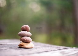 几个圆润的石子落在一起摆在黄色的桌面上保持着平衡