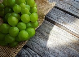 一大串鲜绿色的提子放在午后阳光照射褐色的桌面上食物饮品素材设计