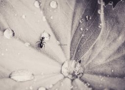 宽阔的叶子上面聚集着许多小水珠一只蚂蚁正在上面觅食动物素材设计