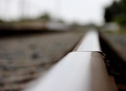 采用背景虚化的技术拍摄散发着金属光泽的导轨延伸向远方交通运输素材设计