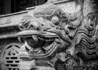 灰色镜头下中国风的狮子头雕塑嘴部张开栩栩如生建筑素材设计