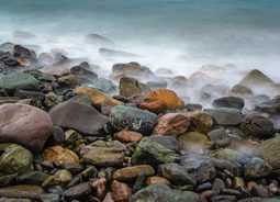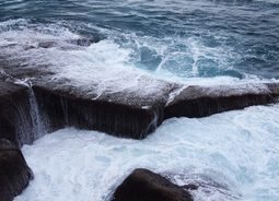 海岸边的礁石被海水冲刷的十分圆滑岸边激起的浪花形成一层层薄雾自然风景素材设计