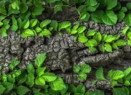 植物素材设计灰色干枯龟裂的老树皮上爬着一串串绿色植物的叶子带来了勃勃生机