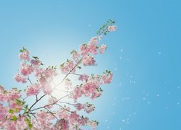 湛蓝的天空下特写绽放的粉色樱花花瓣飘落在空中植物素材设计