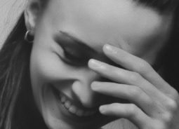 一位国外女士面带着微笑手拄着额头人物素材设计
