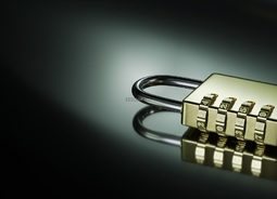 干净的桌面上放置着一把外观小巧的黄铜色的密码锁