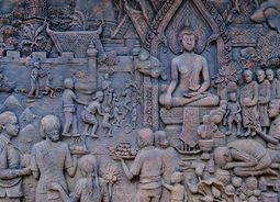 墙壁上雕刻着一颗红铜色的佛像周围是各式各样的的人们建筑素材设计