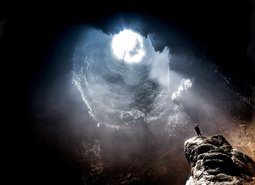 一个人站在昏暗的洞穴里透过洞口望向未知的蓝天