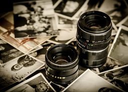 许许多多的富有年代气息的照片上面放着两个摄像机的镜头背景花纹素材设计