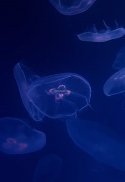 几只水母自由自在的遨游在深蓝色的海洋中身体上发着淡紫色的光