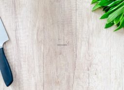 浅色的菜板上面放着一把锋利的刀和一些绿色的蔬菜食物饮品素材设计
