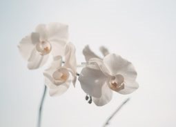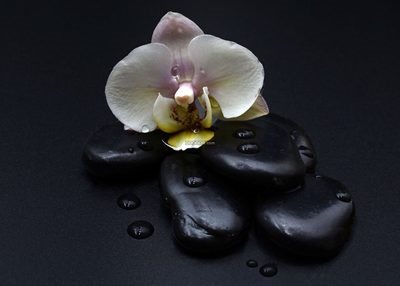 植物素材设计一棵粉白色的兰花静置在黑色的石头上周围几滴晶莹的水滴显得灵气十足