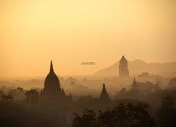 清晨时分缅甸特有风格寺庙建筑笼罩在薄雾之中宛若仙境建筑素材设计