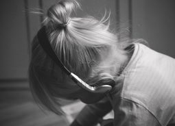 高清特写一位可爱的小女孩带着耳麦专心致志的忙着自己的事情人物素材设计