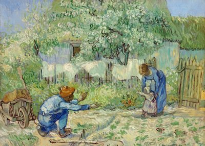 国外风格的农场画祥和的乡村风情一家三口其乐融融背景花纹素材设计